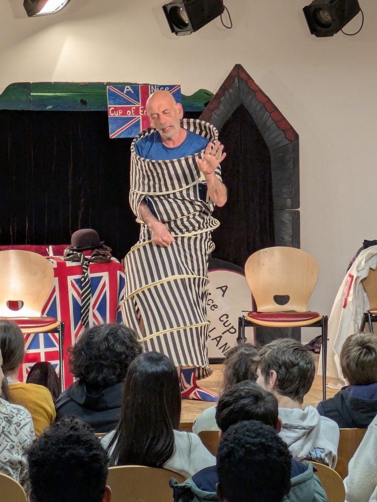 Le 26/27 mars dernier, les élèves de 6ème et 5ème ont pu voir un spectacle tout en anglais intitulé « A nice cup of England ». Certains étaient bien sûr anxieux à l’idée de ne rien comprendre mais ils ont été vite rassurés. Les décors, les costumes, la mise en scène et les quelques sous-titres leur ont permis non seulement de comprendre l’histoire mais également l’humour de la pièce. Et de l’humour, il y en avait !
